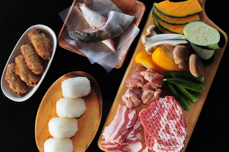 基本メニュー 1人前 黒豚2種&鶏肉、鶏手羽中の塩麹揚げ(お肉類は合計300g)、かんぱちカマ(またはブリ天神焼)、季節の焼き野菜(3~4種)、おにぎり2個、調味料各種、ワンドリンク(生ビールあり)、炭焼きコンロ、炭、テーブル席、BBQパーク利用