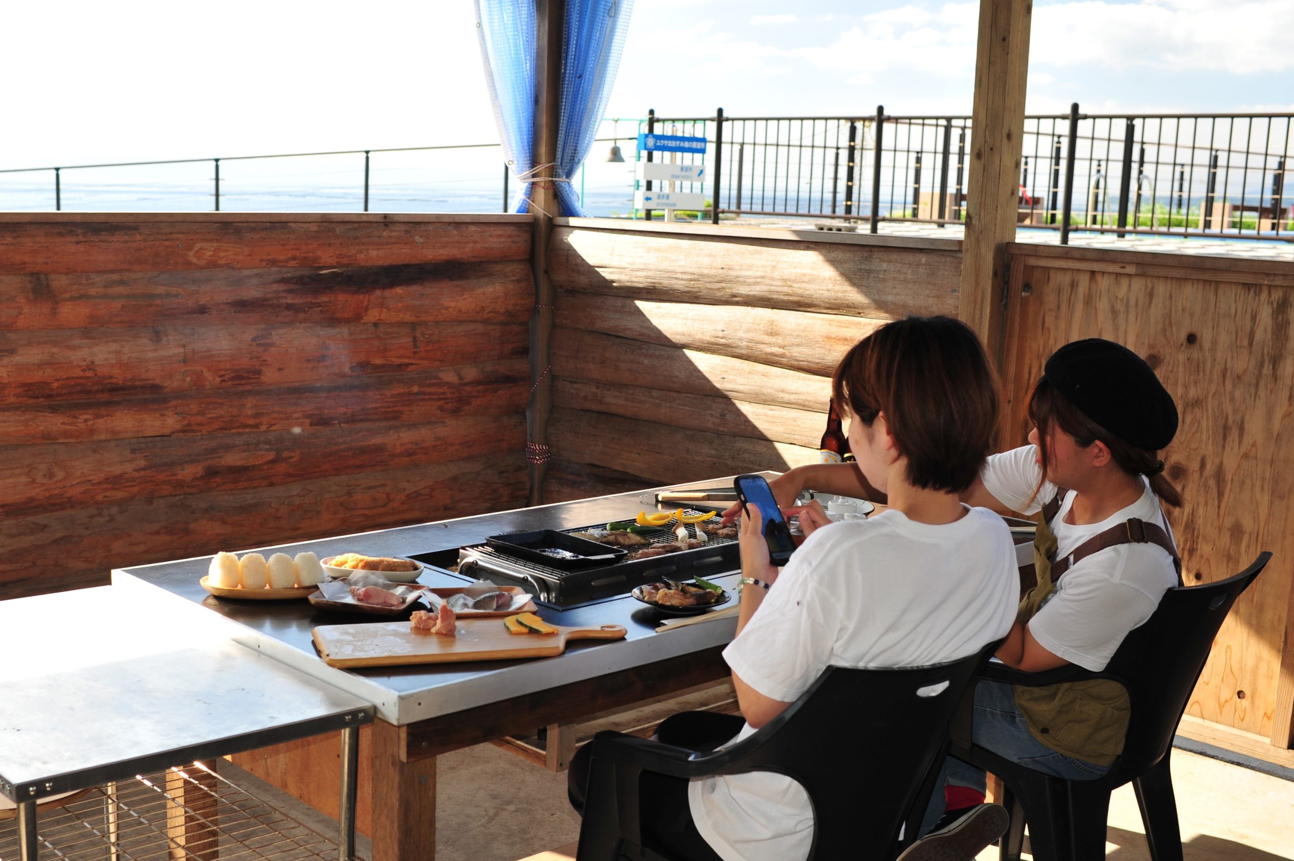 キャンプサイトと錦江湾の景色を望むウッドデッキに、大型タープとBBQテーブルをセットしたBBQスペースです。