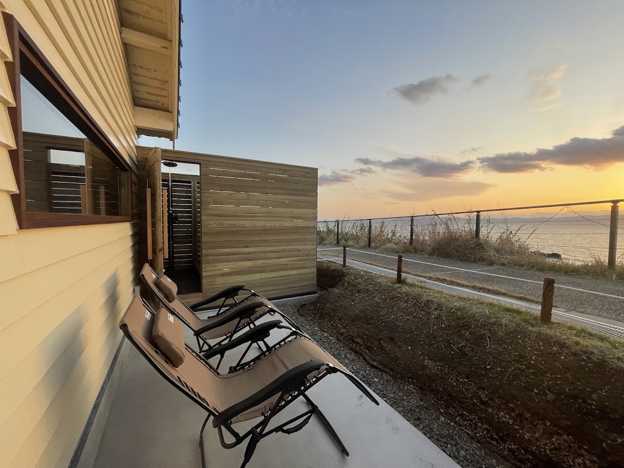 2025年3月7日、「サウナの日」にオーシャンビュー貸切サウナがオープンしました。体育倉庫だった場所を本格的なサウナにリノベーション。水着着用で利用する貸切タイプのサウナになります。8人が一度に入れるフィンランドサウナは温熱環境にも拘り100度~110度の高温サウナとなっており、海を眺めながら入浴できる快適なサウナに仕上がってます。セルフロウリュ用のオリジナル生姜入アロマ水が血行促進や発汗作用が高めます。そして、海をみながらのととのう外気浴空間と水風呂もご用意。ととのい空間は、完全屋外の「露天ととのい場」、フェンスに囲まれた屋根付きの「半露天ととのい場」、エアコンも効く「サウナラウンジ」お好きな場所でリラックスして休憩できます。